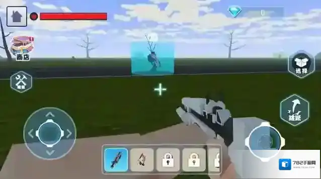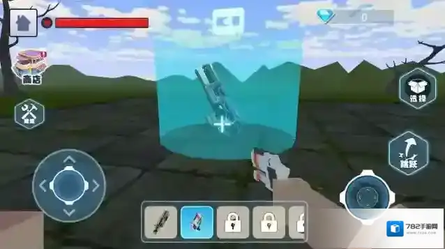 2、看到箭头指向的道具(武器箱),移动角色靠近,自动拾取新武器,切换使用,提升战斗能力。