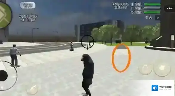 1、操控猿猴,沿箭头指向的目标(如骑平衡车的人)移动,利用左侧摇杆调整方向,靠近触发互动或任务。