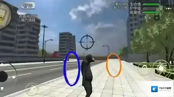 3、在街道场景,跟随箭头标记的目标路径(蓝色、橙色圈),持续移动追踪,完成关卡任务,解锁新区域。