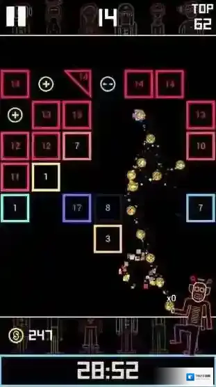 3、冲排名续存挑战:目标是进入前十名,需持续打破砖块并保持生存,通过不断挑战提升成绩,借助物理引擎带来的真实反弹效果,在突破关卡中向更高排名迈进。