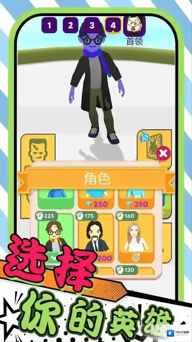 2、进入角色界面后,查看不同角色的属性,选择合适的角色(如箭头指向的戴眼镜角色),花费对应货币解锁并替换,增强角色实力。