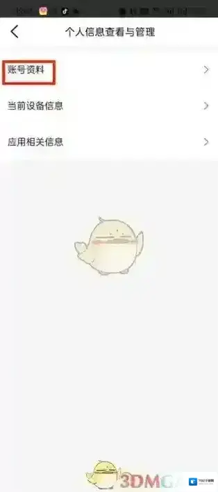 5、在个人信息查看与管理的页面中有账号资料、当前设备信息、应用相关信息三个功能,点击其中的账号资料;