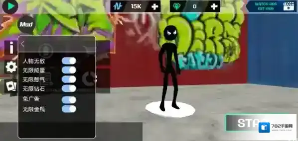 火柴人绳索英雄2内置mod菜单,该版本为内置菜单版本,提供了丰富的菜单功能选项,如人物不会死、大量子弹、大量能量、大量金钱等,玩家可以根据实际情况来开启。游戏中玩家可以操作自己的火柴人战士在城镇中自由行动,游戏拥有超大的地图且自由的玩法,体验出色。