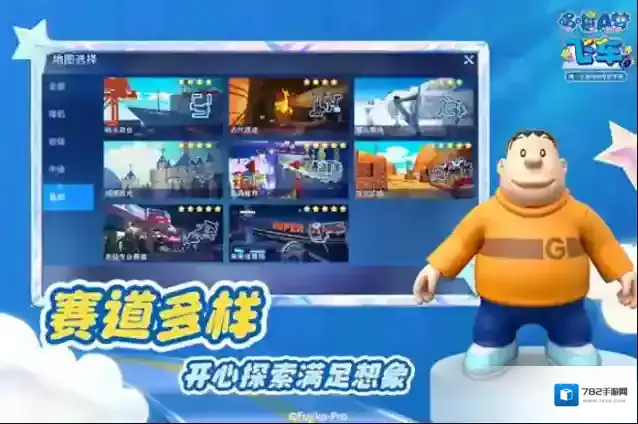 3、兼具奇幻与趣味的赛道,多种地图随意选择。太空旅行、未来都市等奇幻地图,大雄家的后院等经典场景,玩家可驾驶赛车一路狂漂,领略不同的赛道风光。