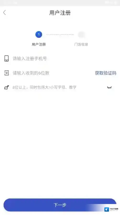 2、进入用户注册界面,依次填写手机号、验证码和密码后,选择下方下一步选项。