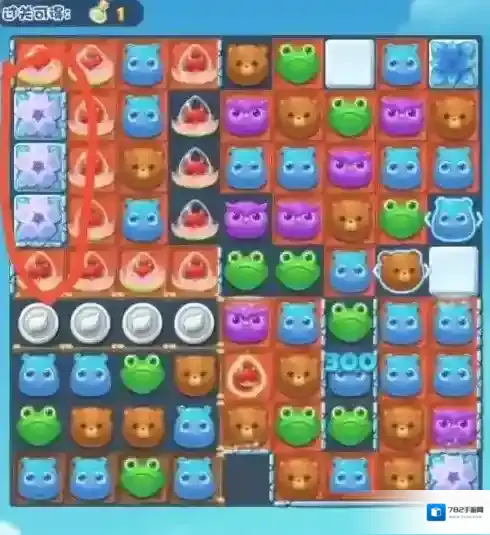 6、花骨朵消除后消除剩下的三个冰块旁边的冰条,冰条完了消除冰块,冰条两次,冰块三次。